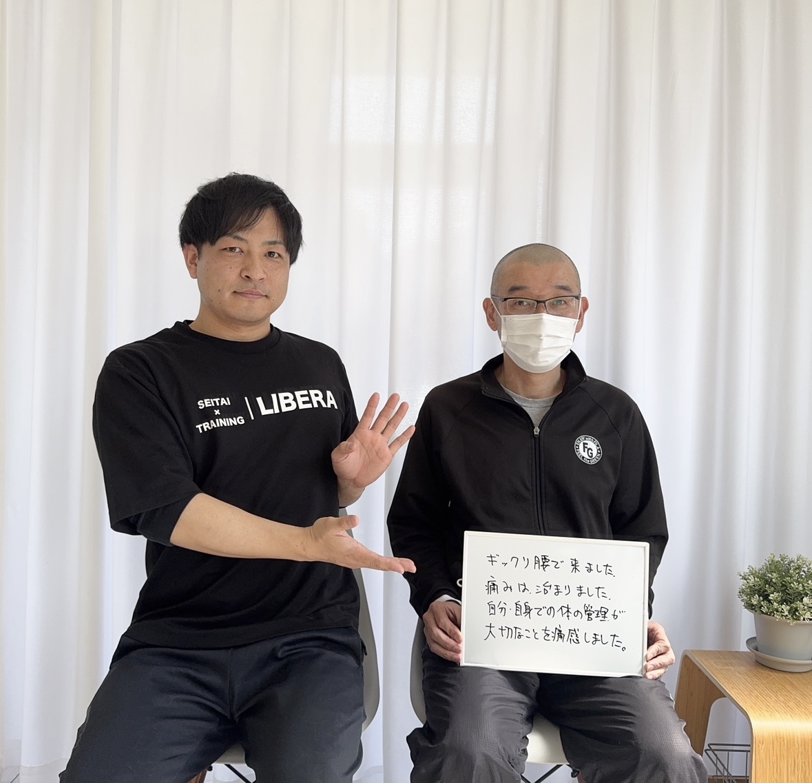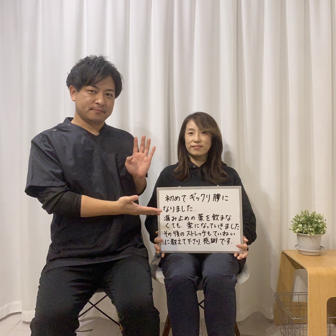 私はあなたの不安をすべて取り除きます。あなたは腰痛のない生活を送れます。まずはスタートを切ってください。腰痛のあなたのご来院をお待ちしております。一緒に頑張っていきましょう!